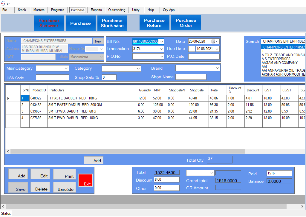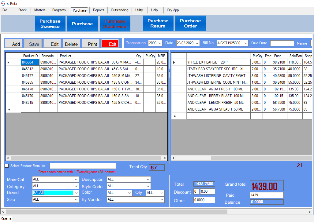•  Using Barcode, Item Code and Item Name you can Add purchased item