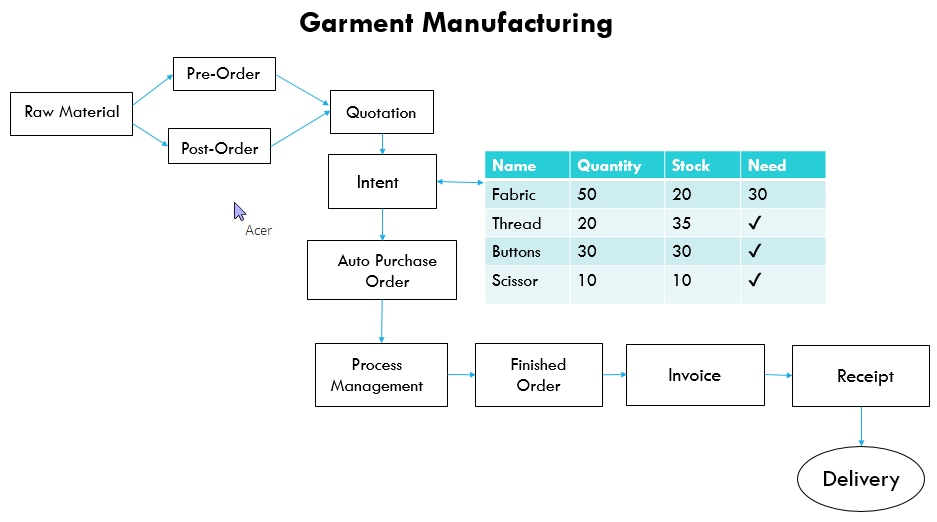 You can maintain and manage your business flow, for example, if your company manufactures Clothers, you can maintain and manage the process as: Fabric Cutting Ironing Packing Stock