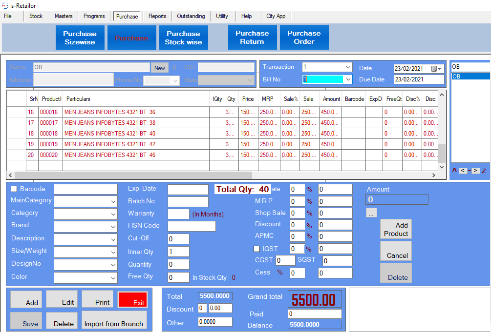 •  Adding of purchased item by using Barcode, Item Code and Item Name